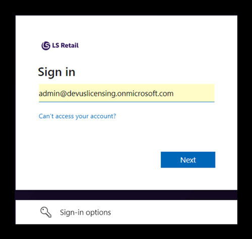 Open LS Retail portal or Business Hub through a browser and sign in with your Entra ID (username@domain.com) and press Next.