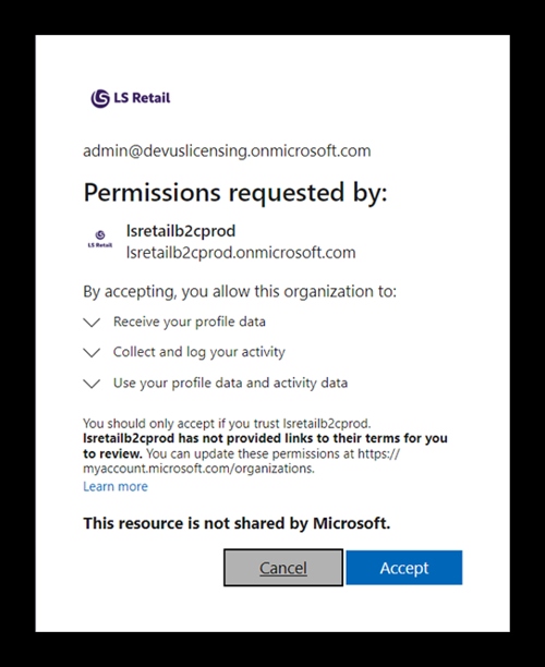 A secure relationship is pending approval. The user must review and grant permission to connect with lsretailb2cprod, which hosts the LS Retail Portal and Business Hub applications.