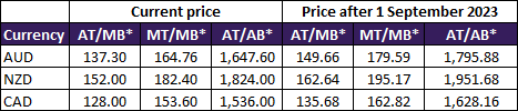 To adjust for local currency fluctuations and adjust prices for Microsoft cloud services to global levels and software pricing within the region. Starting 1 September 2023, pricing for SaaS licenses will adjust for the currencies shown on the chart below: